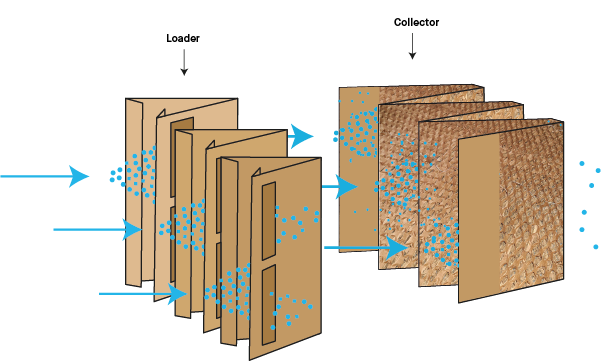 The internal V-shaped filter cavities allow the creation of a venturi effect and force the flow of particulate-laden air to change direction.